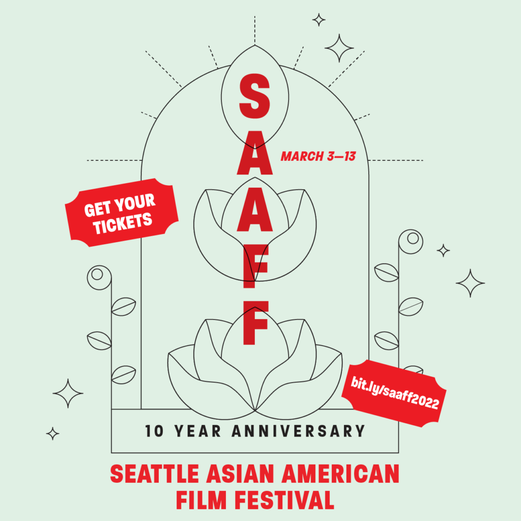 The Seattle Asian American Film Festival (SAAFF) proudly celebrates ten years of sharing Asian American independent films with the Pacific Northwest with its 10th annual film festival March 3–13, 2022. This year’s 11-day festival will offer 13 outstanding feature-length films and 12 exciting shorts programs, including 2 free programs.Due to continued pandemic precautions, there will be 5 limited in-person events, including 4 drive-in screenings andone special presentation screening at Northwest Film Forum (NWFF).